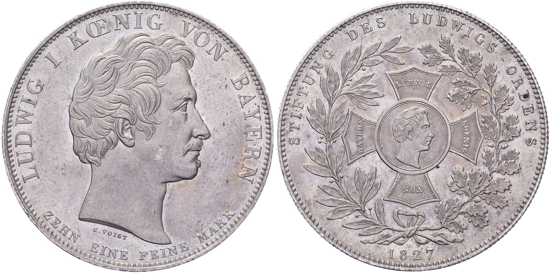 Geschichtstaler 1827, Stiftung des Ludwig-Ordens. AKS 118; KM 732. Vorzüglich.Ankauf Jean Elsen, Liste 225, Mai-August 2003, nr. 917.