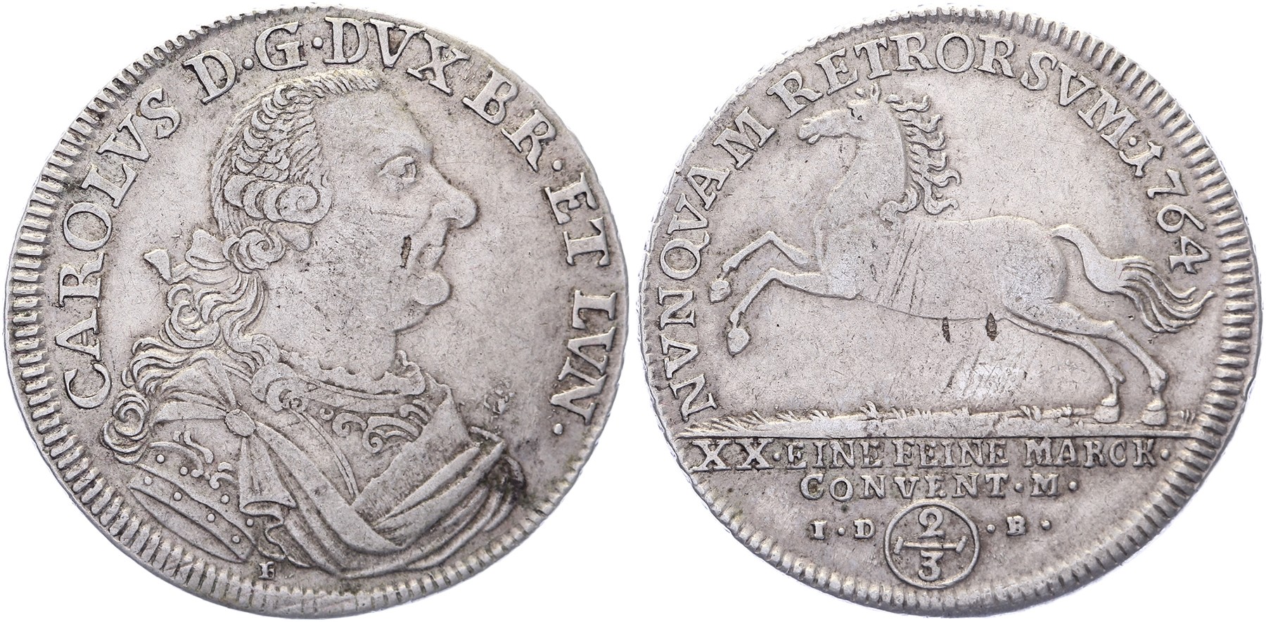 2/3 Taler 1764. Welter 2733; Schön 317; KM 973.1. Sehr schön.