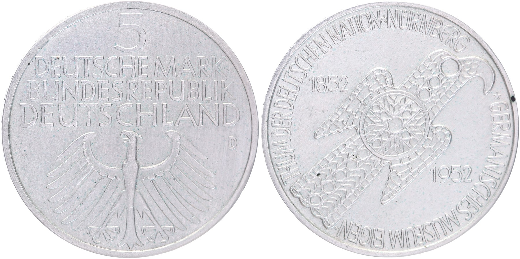 5 Mark 1952 D ‘Germanisches Museum’. Jaeger 388; KM 113. Vorzüglich.