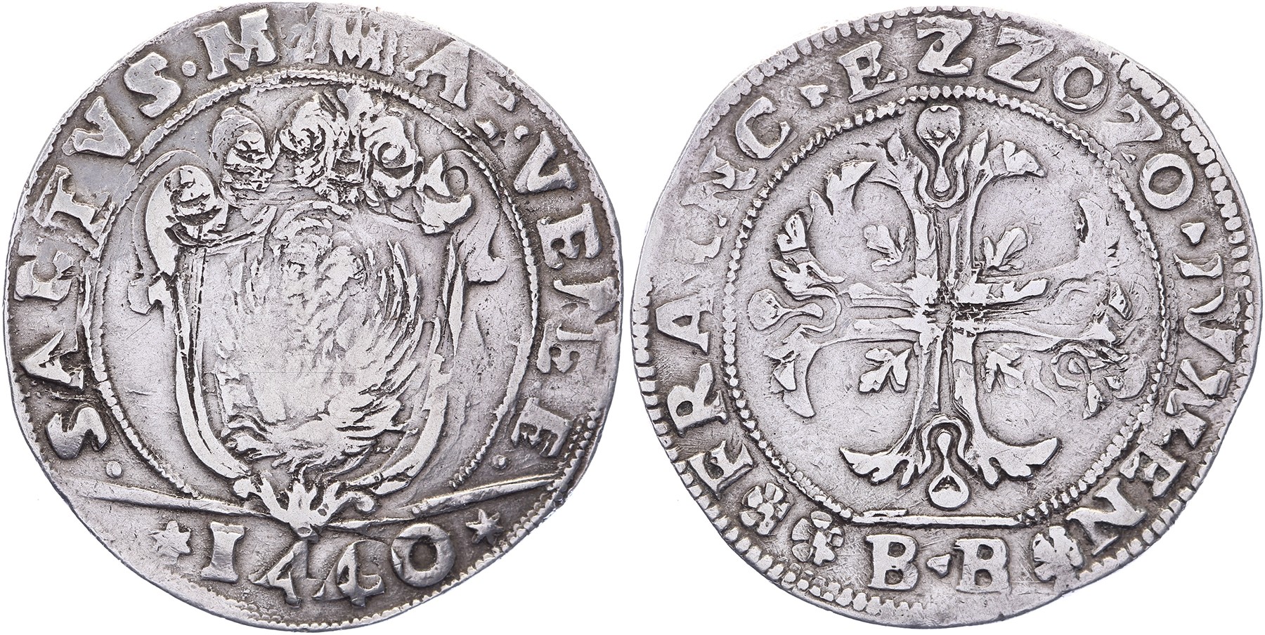 Scudo n.d. (1636-1637) BB. Dav. 4249; KM 182. Under the lion of St. Mark the value appears to be “1440 soldi”; due to a double struck execution. Almost VF.
