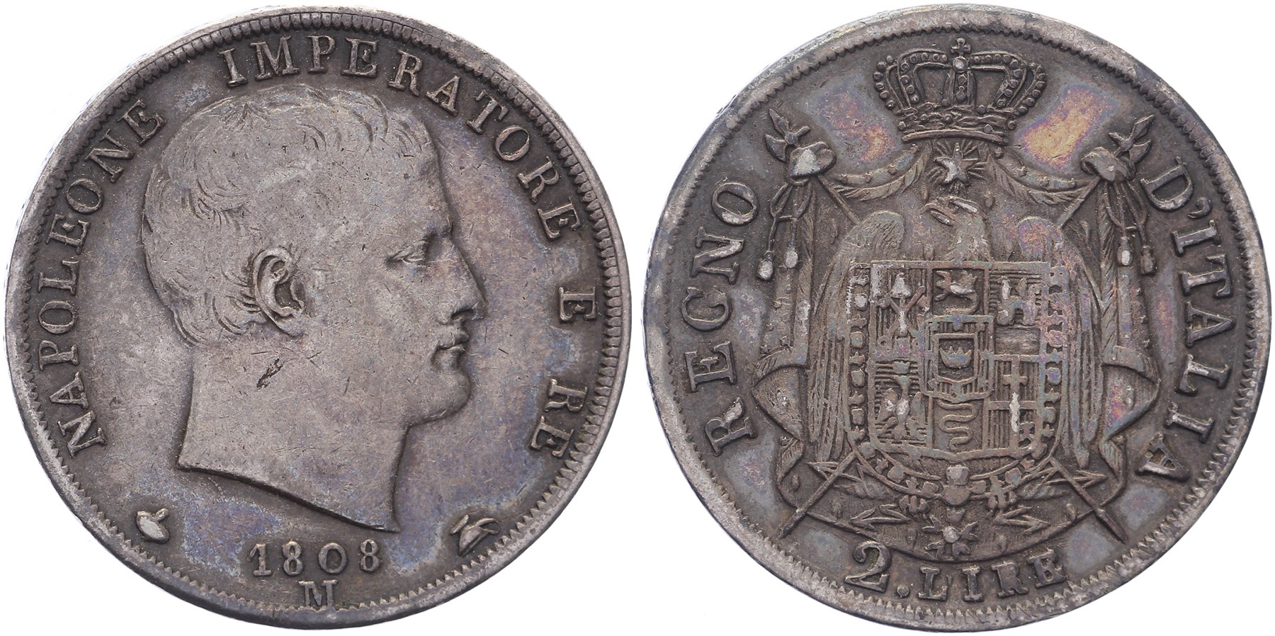 2 Lire 1808M, edge lettering incuse. KM C9.1. VF.