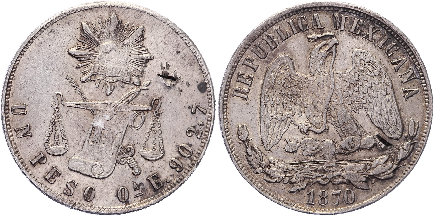 1 Peso 1870 Oaxaca. KM 408.6. Cutmarks in field. AU.