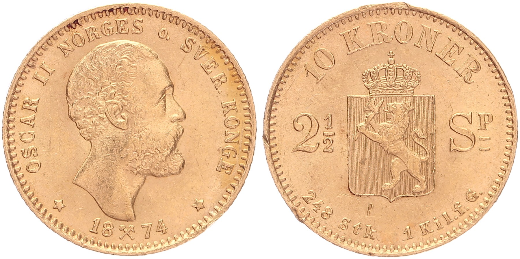10 Kroner / 2 ½ Speciedaler 1874. KM 347; Fr. 16. Minor edge nick. AU.