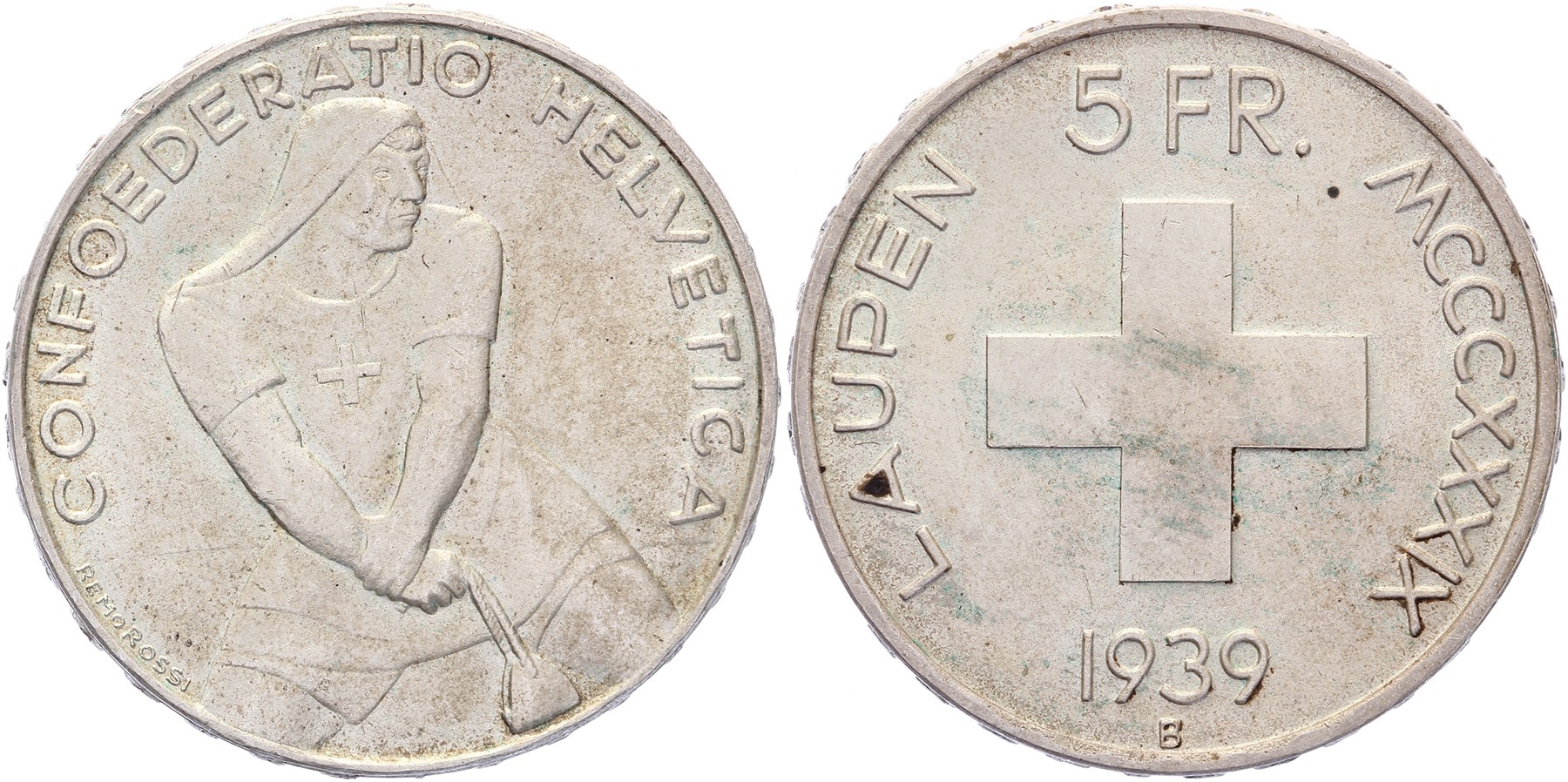 5 Franken 1939 B ‘Laupen’. KM 42. EF / XF.