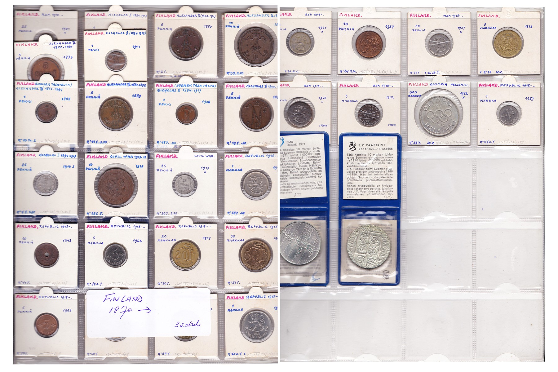 Finland. Lot (32), type collection, o.a. 5 Pennia 1889 and 500 Markkaa 1952.