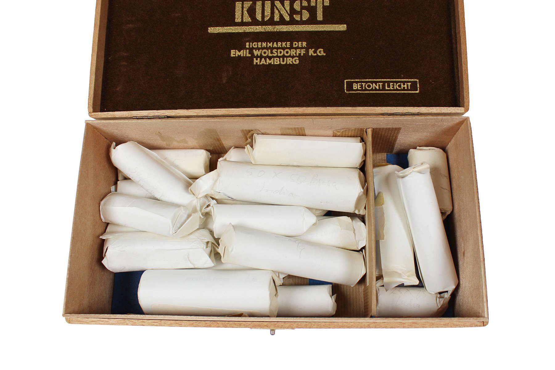 Kistje met muntrolletjes uit o.a. India, Indonesië, Hong Kong, Ecuador, Bahrein en Saudi-Arabië. Voornamelijk UNC.