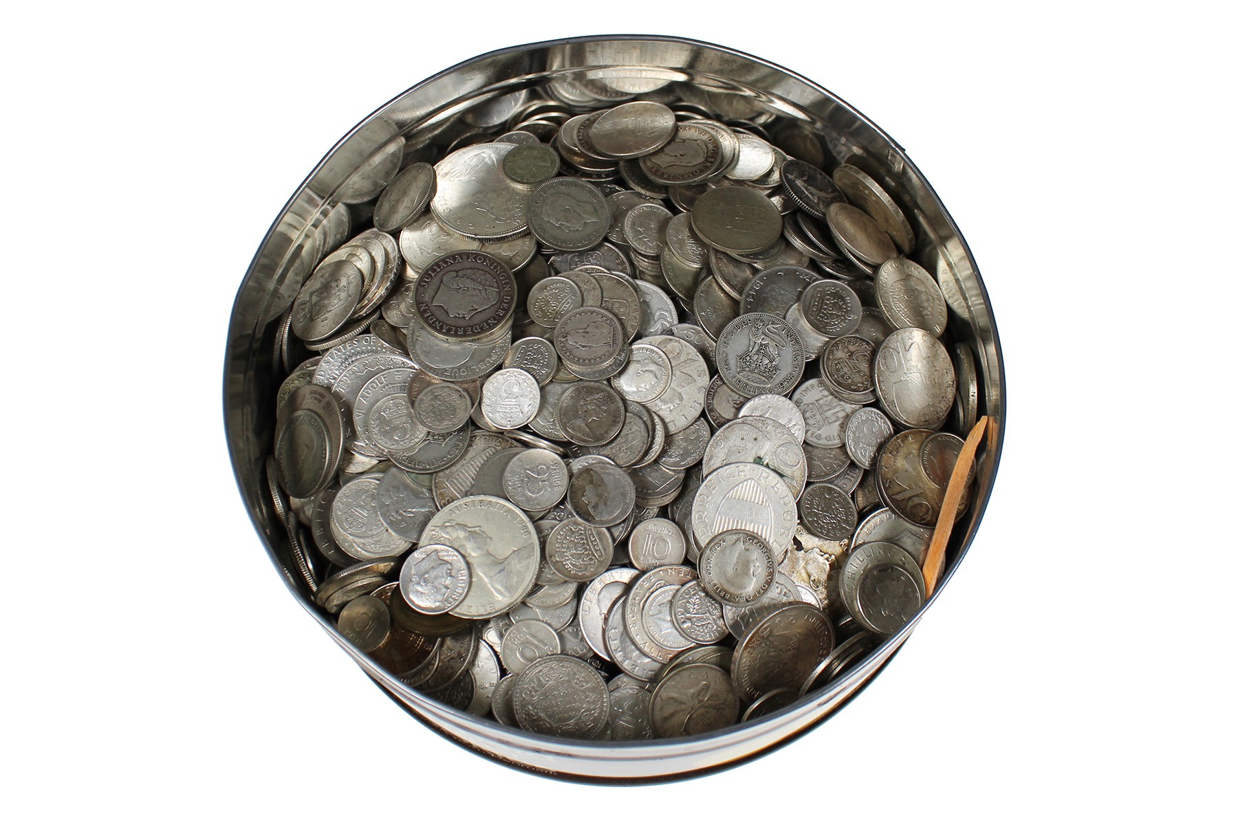 Blik met ca. 4,4 kilo onuitgezocht buitenlands zilver van verschillend gehalte, ook betere!