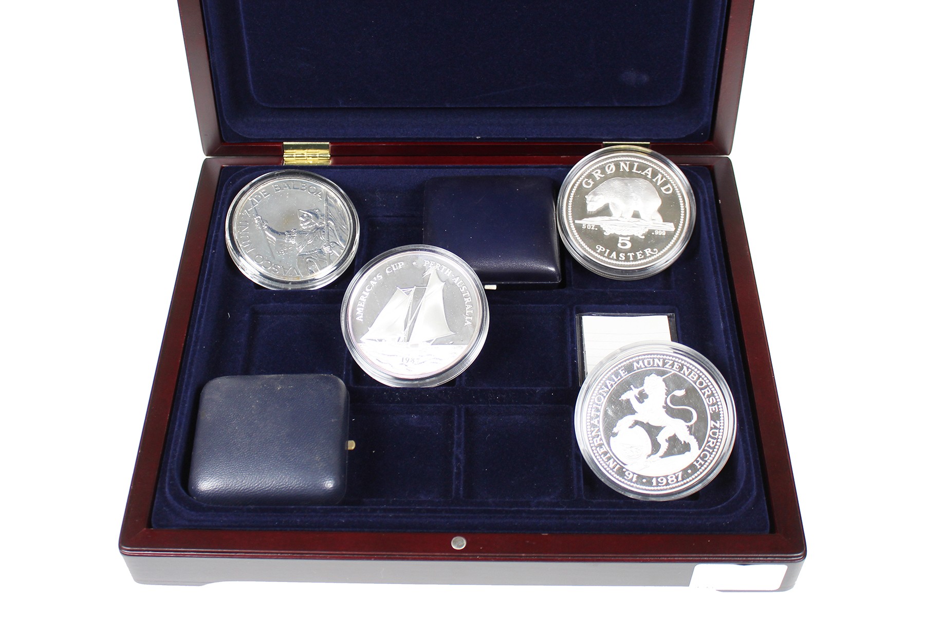 Kist met o.a. 2 x 20 Balboa Panama en 25$ Samoa (5 ounce). Ca. 750 gram sterling zilver.