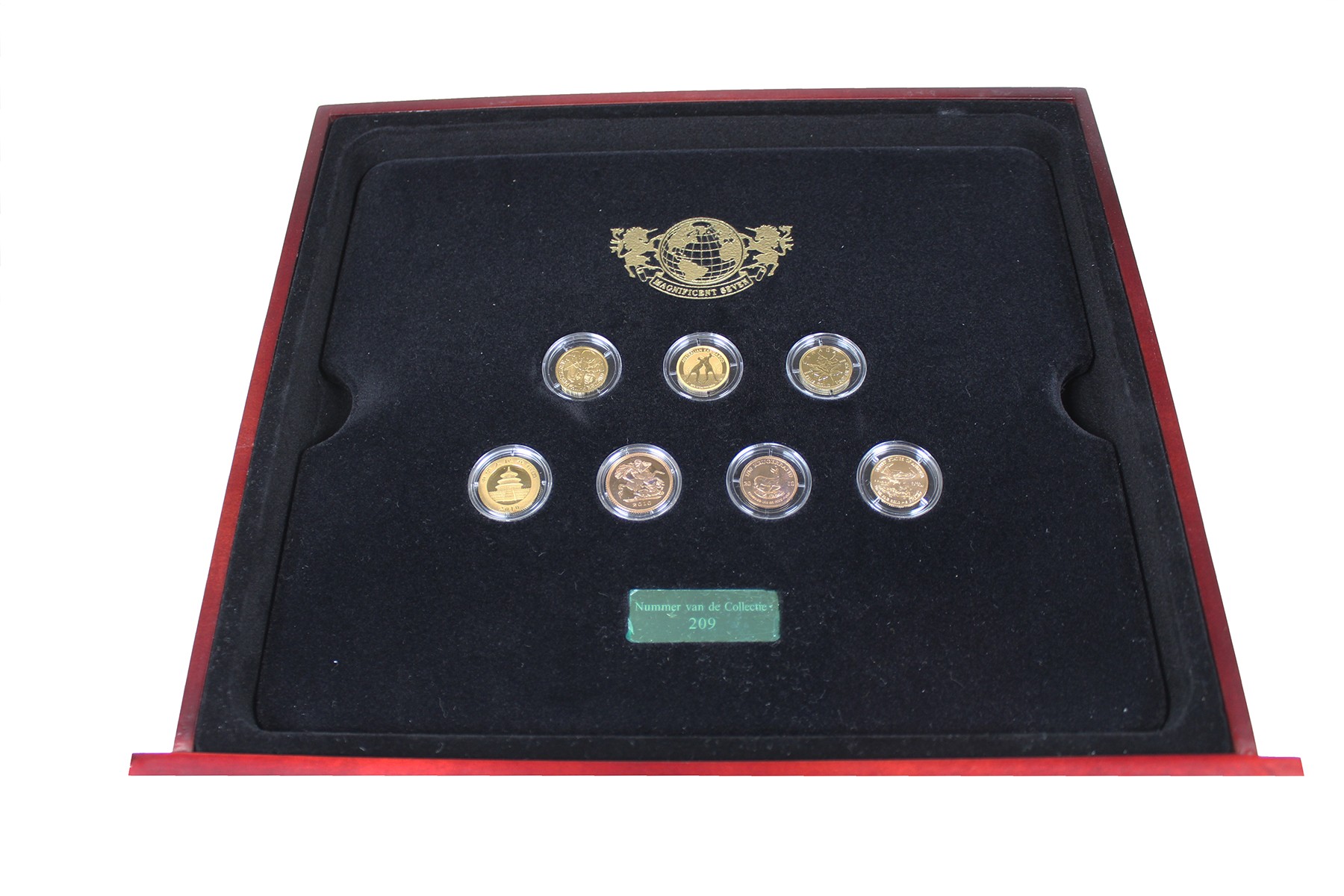 The Magnificent Seven 2010. Luxe kist met 7 stuks gouden munten van 1/10 troy ounce elk. Australia, Austria, Canada, England, USA, China and South Africa. UNC.
