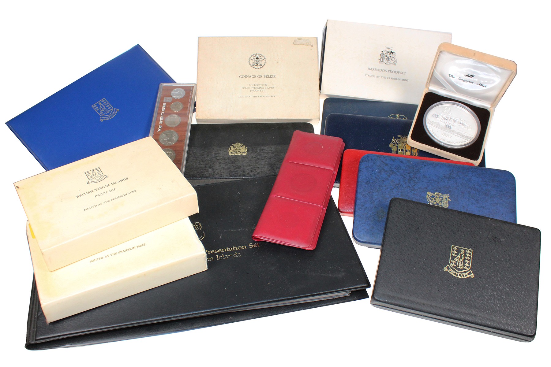 Doos met ca. 15 stuks proof- en prestigesets wereld. O.a. Belize, British Virgin Islands, Cook Islands, Guyana, Jamaica, Solomon Islands etc. Veel van Franklin Mint.