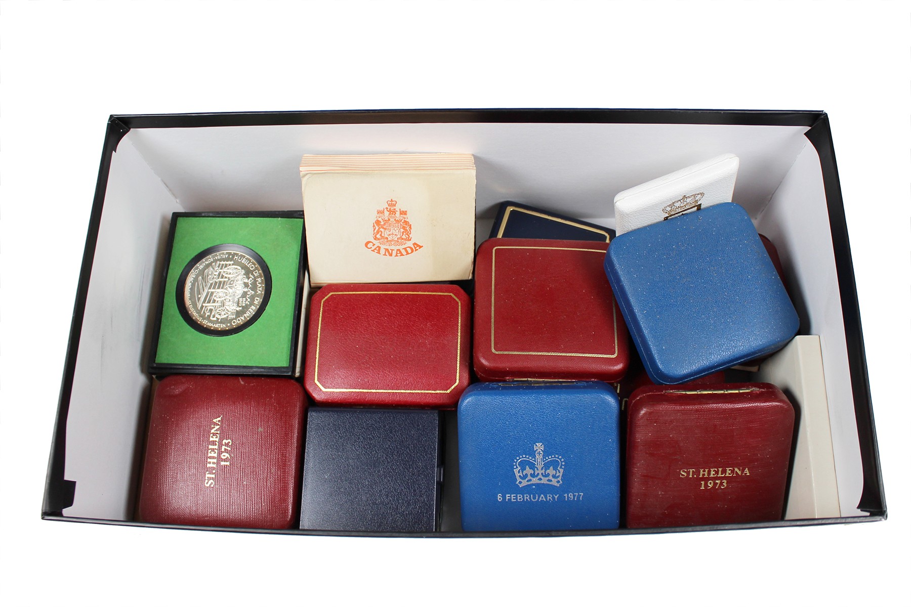 Doos met ca. 25 stuks voornamelijk sterling zilveren crown-size coins from all over the world. O.a. Nederlandse Antillen, St. Helena, Canada, Engeland, Jersey etc.