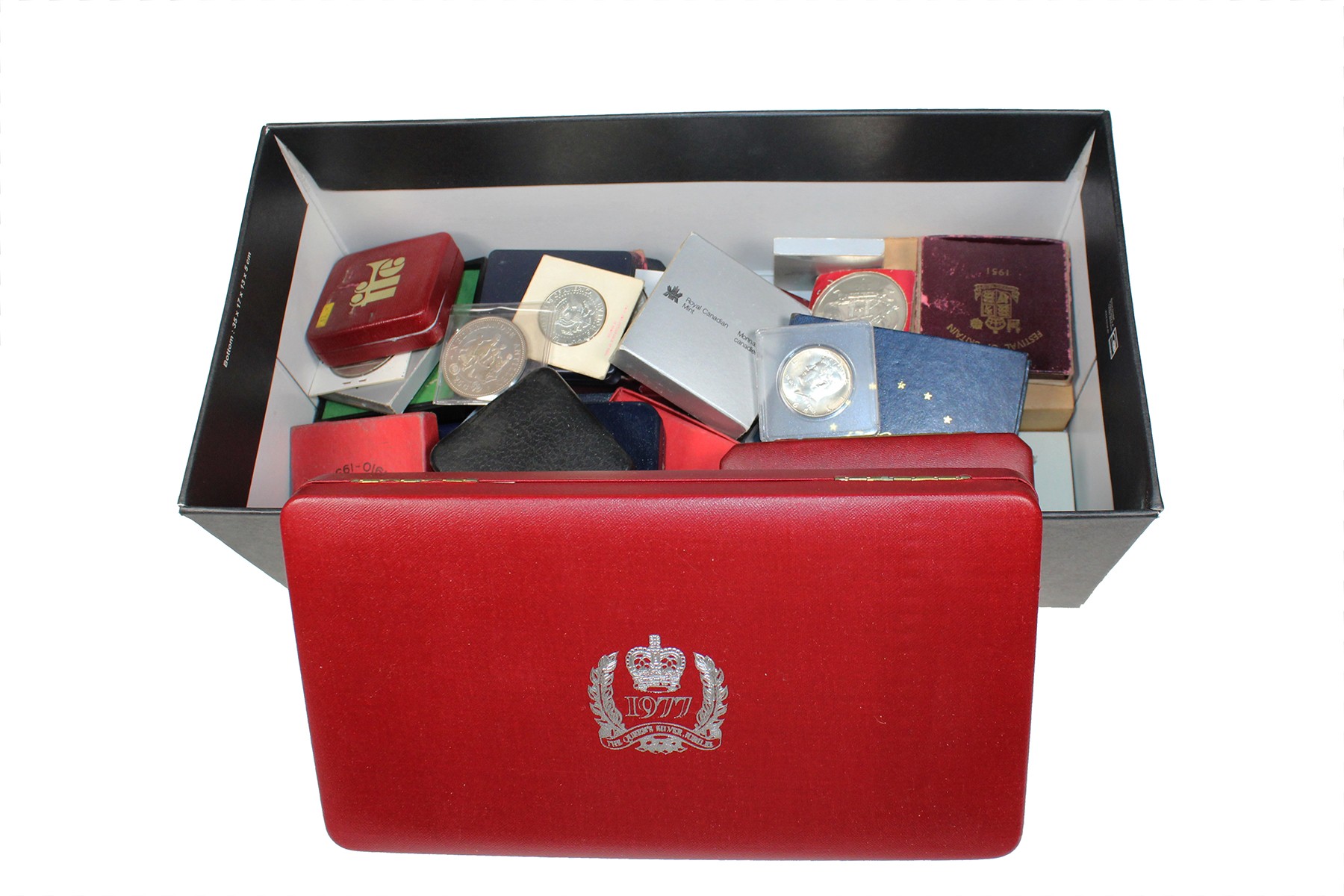 Doos met ca. 35 stuks voornamelijk sterling zilveren crown-size coins from all over the world. O.a. Jersey, Guernsey, Gibraltar, St. Helena, Canada, USA, Engeland, Nederlandse Antillen etc.