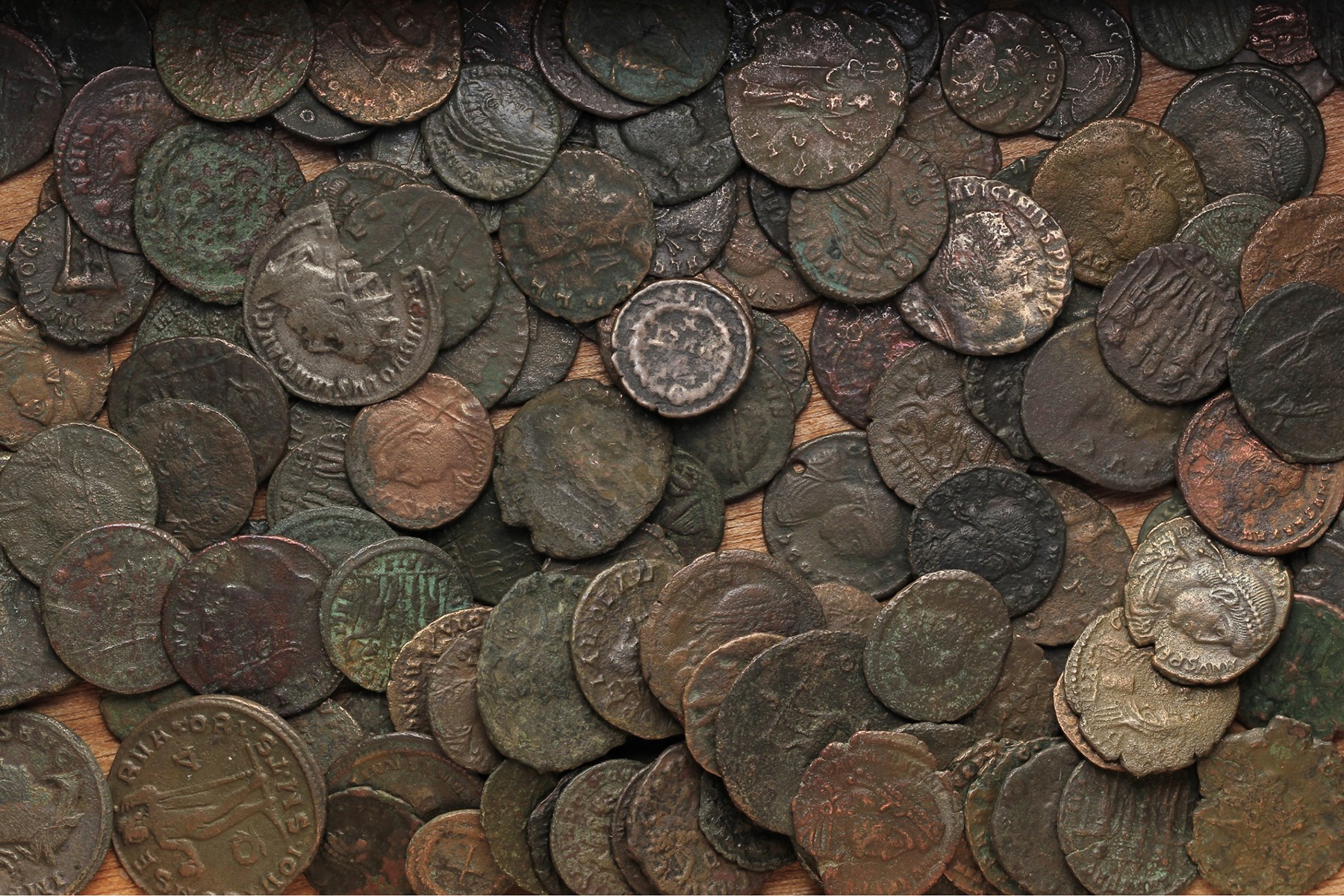 Kistje met ca. 140 stuks Romeinse munten, ongedetermineerd. Leuk studielot!