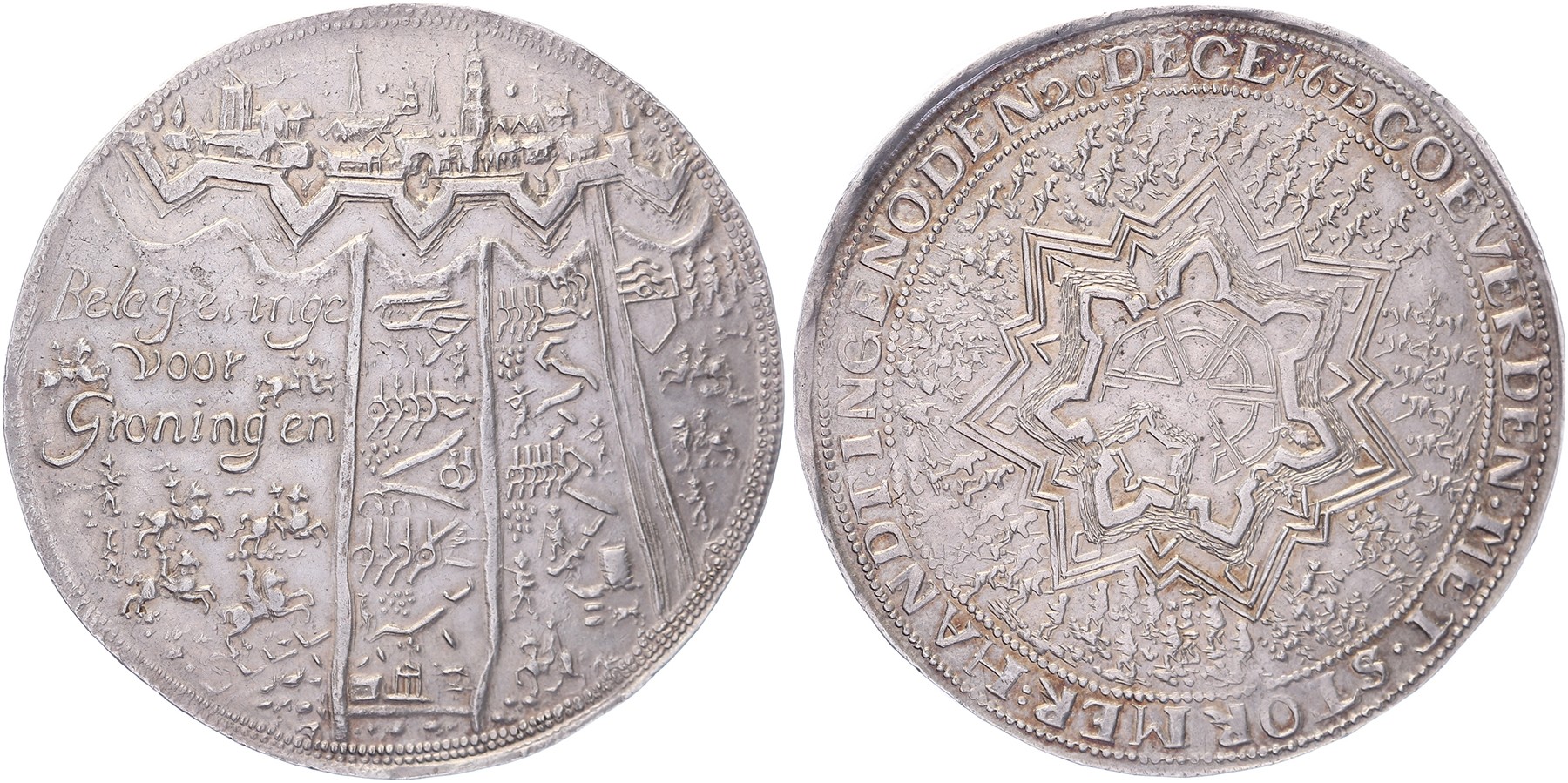 1672 Verdediging stad Groningen; inname Coevorden. Belegeringsscène stad Groningen. / Stervormige plattegrond Coevorden. AR 55,1 [32,36 gr.]. vL III-109.3; Weiler 13. Ruim zeer fraai.Ex Auktion 49 Kricheldorf, februari 2017, lot 757.