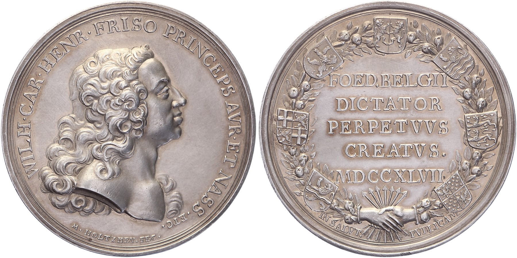 1747 Verheffing Willem IV tot stadhouder. Buste naar rechts. / Vijfregelig opschrift binnen krans met wapens zeven provinciën en pijlenbundel. AR 49,3 [44,33 gr.]. VvL 246. M. Holtzhey. Prachtig.