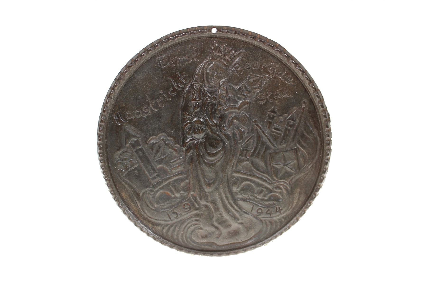 1944 Maastricht. Dankpenning aan Amerikaans leger als eerste bevrijde stad. Staande heilige met kind. Op de achtergrond stadswallen met stadswapen en vlaggen. / Blanco.IJzer gegoten 158. Met ophanggaatje in de rand. Zeldzaam. Zeer fraai.