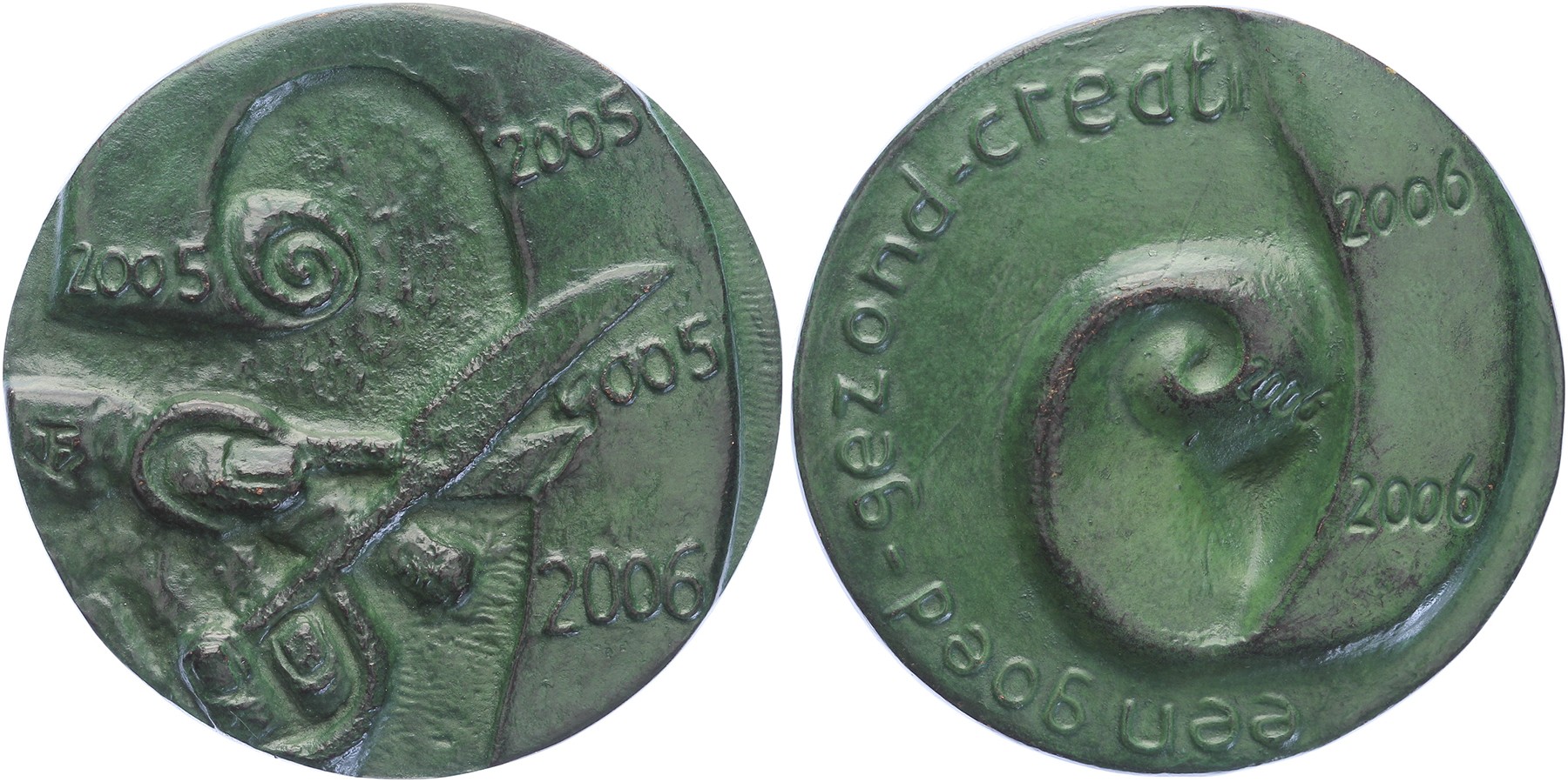 2006 Afrollend papier / Schaar en jaartal. Æ 58 gepatineerd. Oplage 14 stuks. Prachtig.