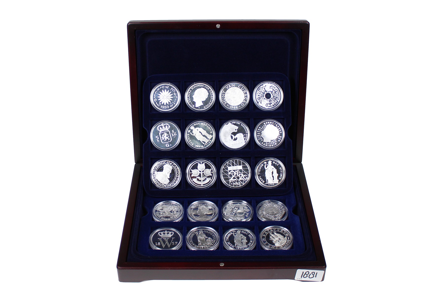 Bruine cassette met 33 sterling zilveren replica’s van de serie ‘laatste gulden’. Ruim 1000 gram 925/1000.