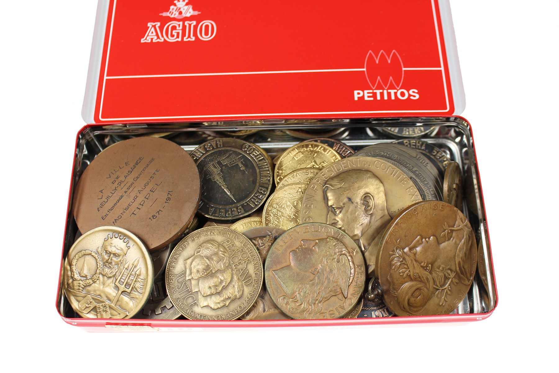 Rood Agio-blik met ruim 40 stuks, voornamelijk bronzen penningen onuitgezocht.