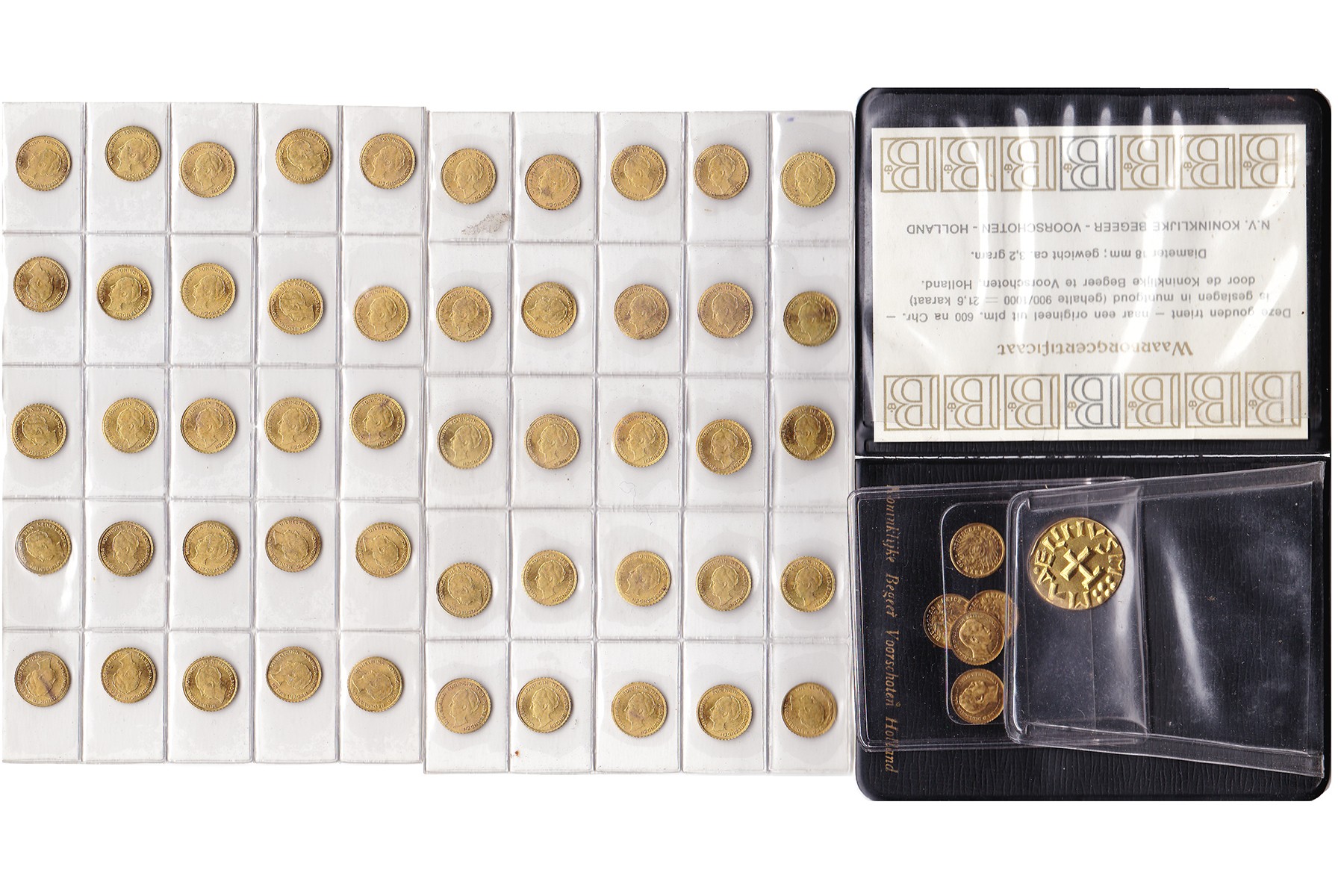 Doosje met 54 stuks goudkleurige miniatuurpenninkjes. Toegevoegd: Gouden Triens, naslag 3 gram 900/1000.