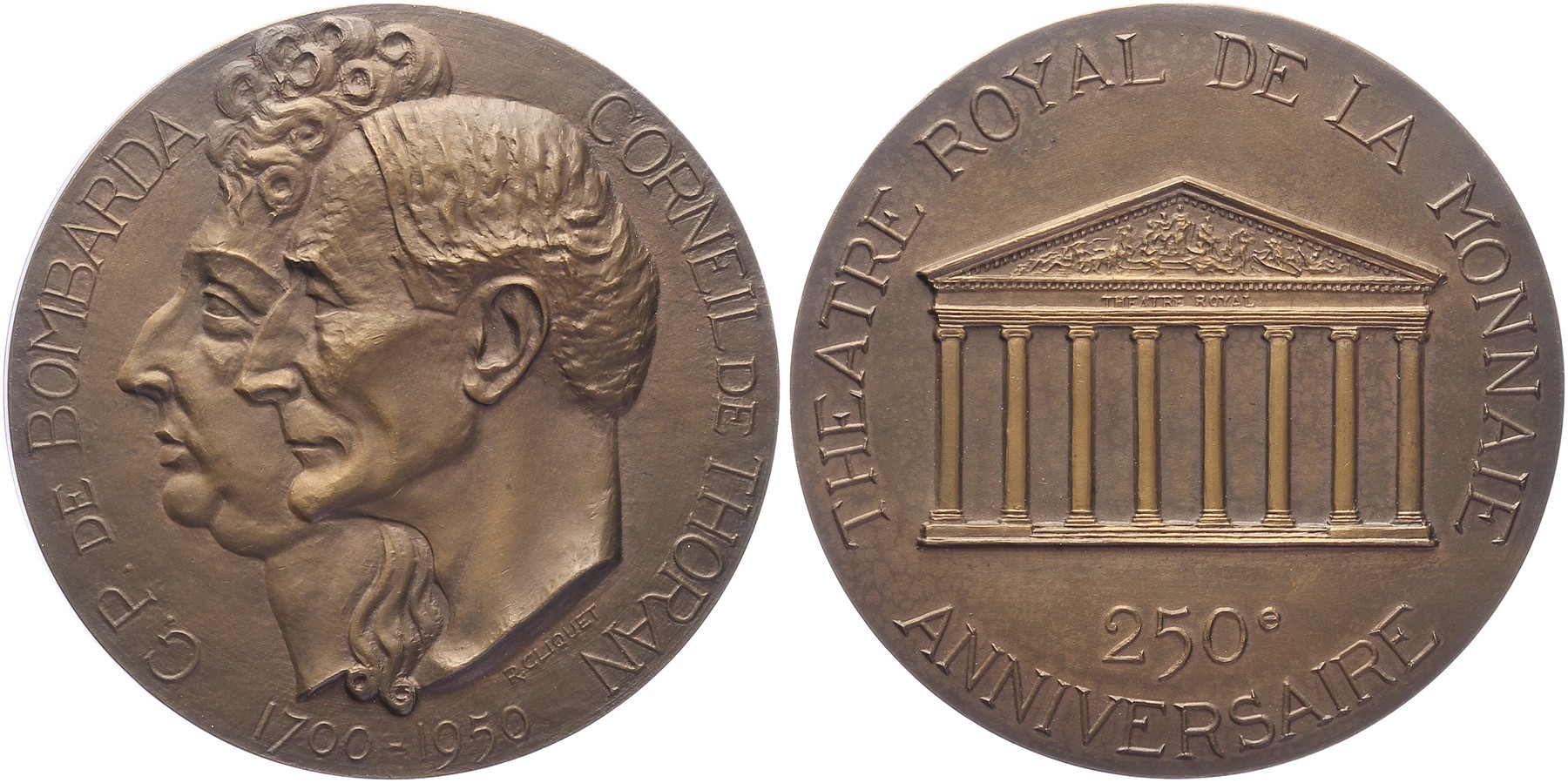 1950 Brussel. 250-jarig bestaan Théâtre Royal de la Monnaie. Dubbelportret Bombarda en Thoran naar links. / Frontaanzicht theater. Æ 71,4. R. Cliquet. Prachtig.