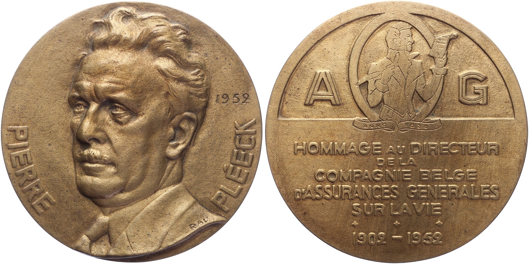 1952 Hommage aan Pierre Pléeck, directeur Compagnie Belge d’Assurance Générales sur la Vie. Hoofd Pléeck half naar links. / Opschrift onder logo. Æ 97. Landi 18var. M. Rau. Prachtig.