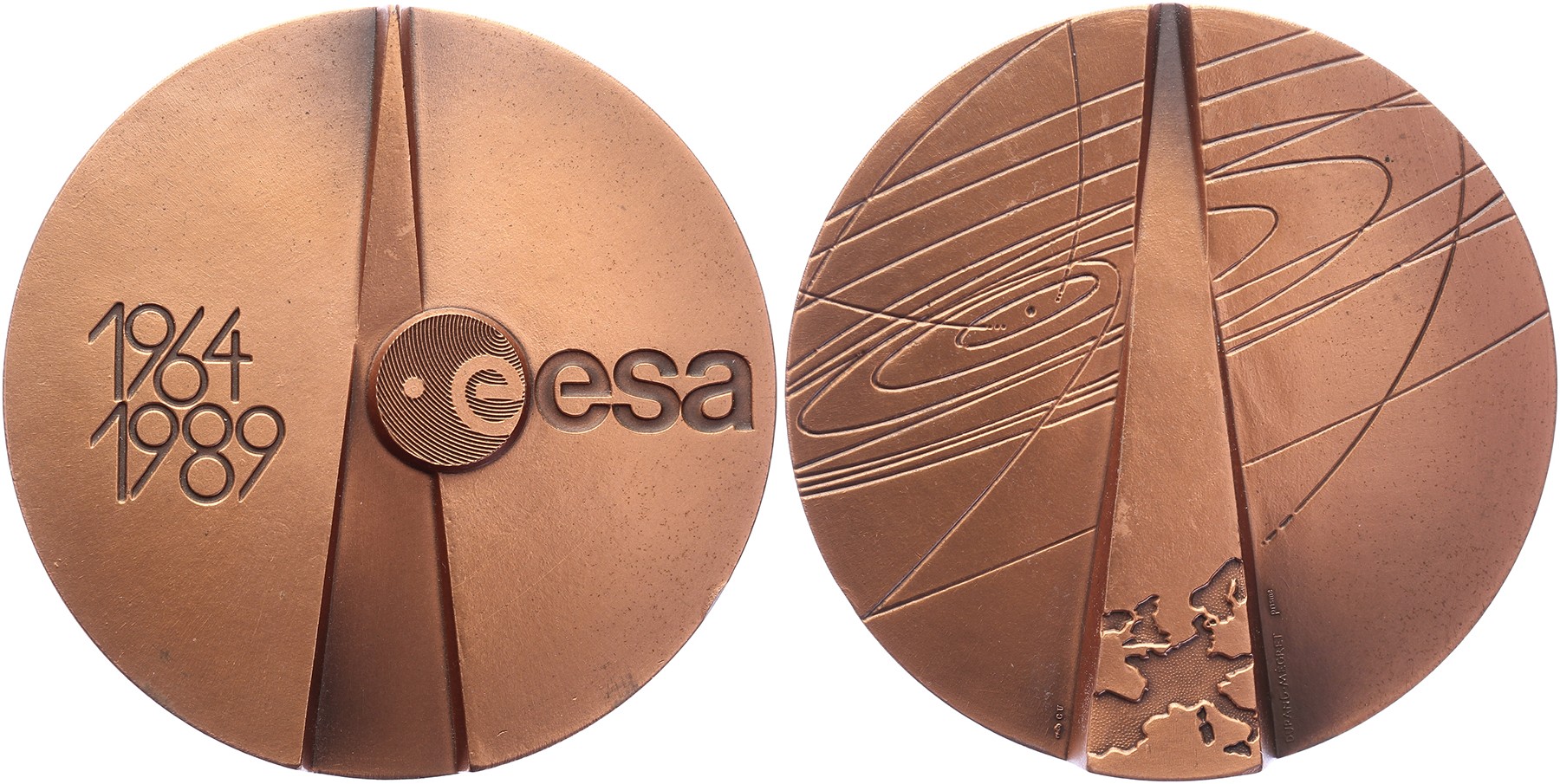 1989 25th Anniversary ESA (European Space Agency). Logo and dates. / Europe surrounded by planetary orbits. Æ 81. Durand-Mégret. Almost UNC.