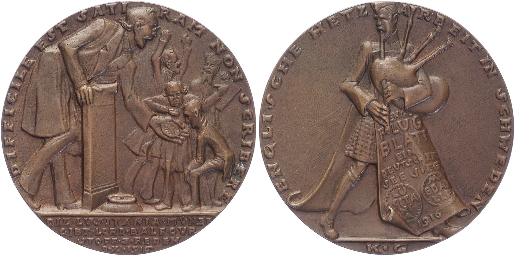 1916 Englische Hetzarbeit in Schweden. Schottischer Highlander spielt auf Dudelsack. / Lord Balfour auf Platform zeigt Lusitania Medaille an Asquith und Churchill. Æ gegossen 57,6. Kienast 156A. Vorzüglich.