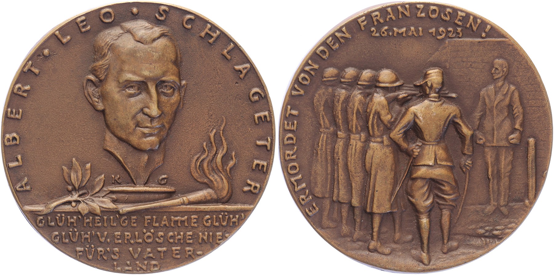 1923 Albert Lee Schlageter ermordet von den franzosen. Kopf Schlageter über brennenden Fackel. / Hinrichtung von Schlageter. Æ gegossen 61. Kienast 300. Vorzüglich.