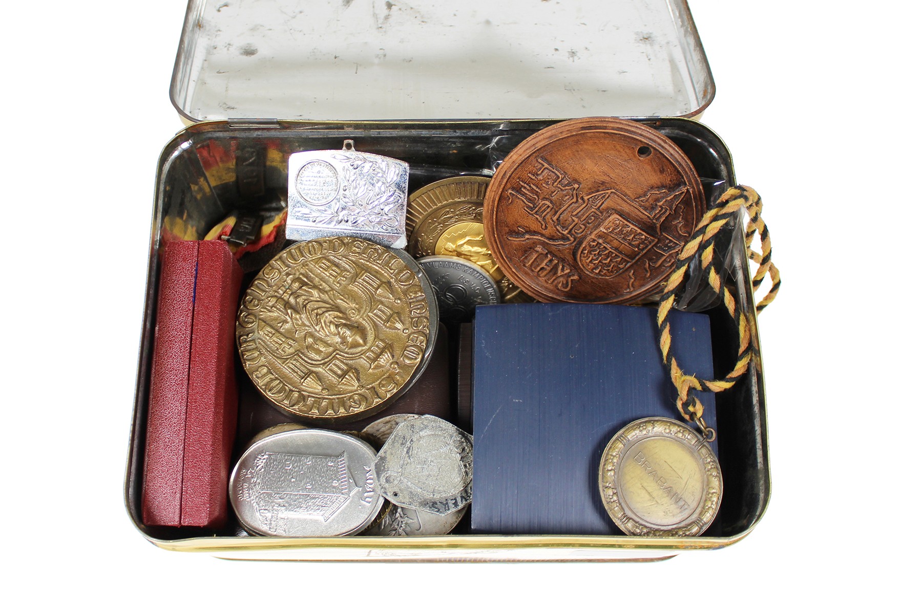 Blik met diverse Belgische penningen o.a. 1978 Brugge Algemene Vergadering EGMP.
