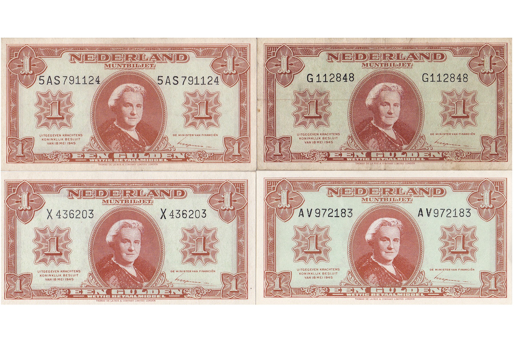 Lot (4) 1 Gulden 1945 Muntbiljet Wilhelmina. Alle vier types.Mev. 06-1a/1aa/1b/1c; PL 6.a1/6.a2/6.b/6.c2. Diverse kwaliteiten.