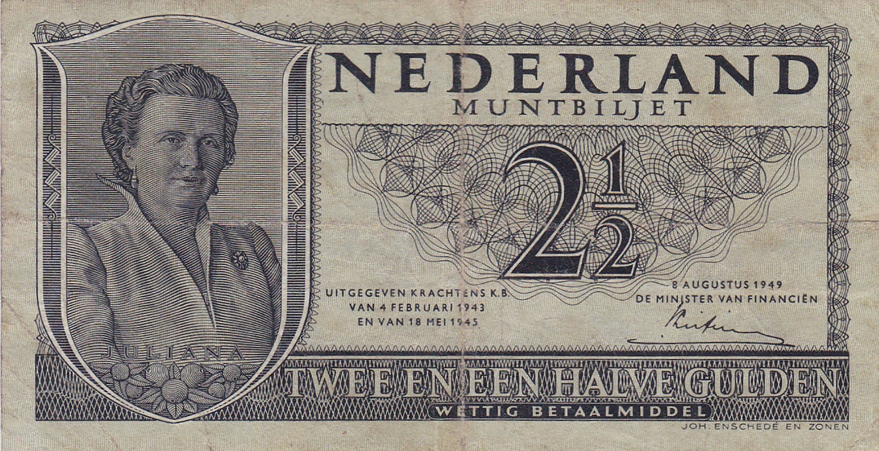 2 ½ Gulden 1949 Muntbiljet Juliana. Mev. 16-1a; PL 17.b [#AAA 020467]. Ruim fraai.