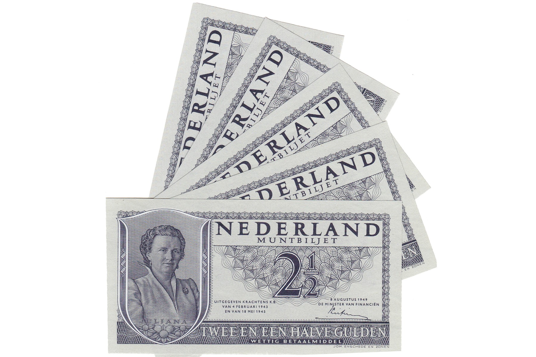 Lot (5) 2 ½ Gulden 1949 Juliana. Mev. 16-1b; PL 17.a. Opeenvolgende serienrs. UNC.