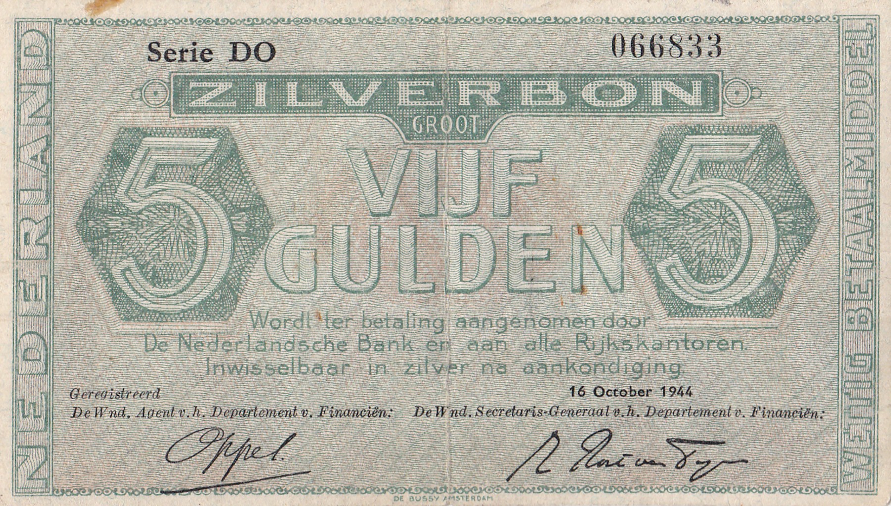 5 Gulden 1944 Zilverbon. Mev. 22-1d; PL 21.c [# DO 066833]. Zeer fraai.