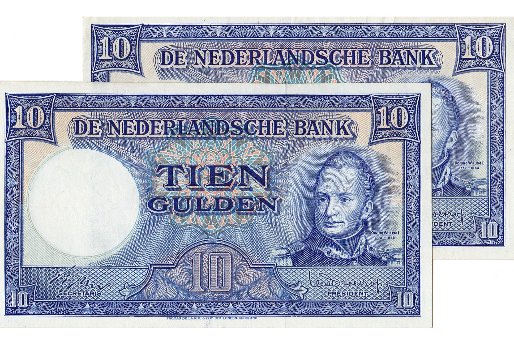 Lot (2) 10 Gulden 1949 Willem I. Mev. 47-1; PL 44.a+b [# 4 AK 328475] + [# 4 AR 857791]. Vrijwel UNC.