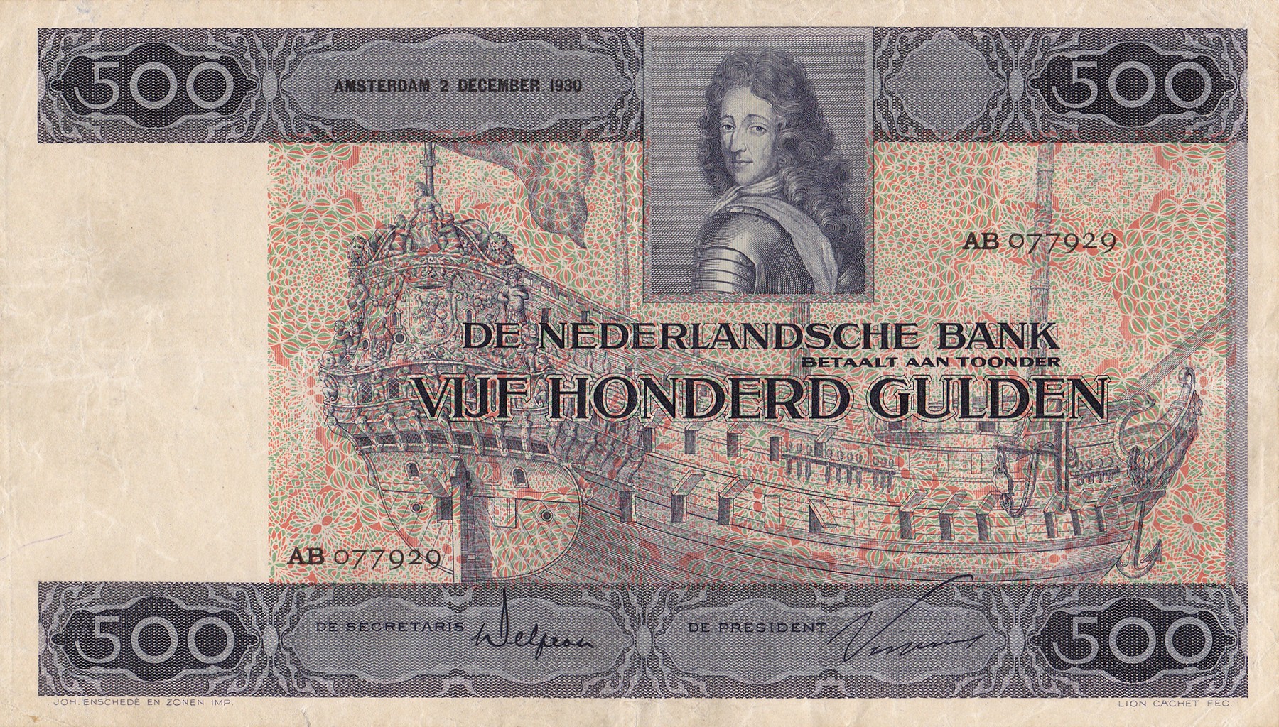 500 Gulden 1930 Stadhouder Willem III. Mev. 143-1; PL 118.a [# AB 077929]. Bijna prachtig.
