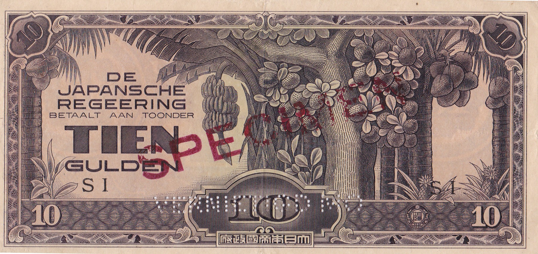10 Gulden z.j. Japanse bezetting. Specimen + perforatie “VERNIETIGD MO”.comp. Pick 125s; PL --- (vgl. 25.7s) [# SI]. Prachtig.