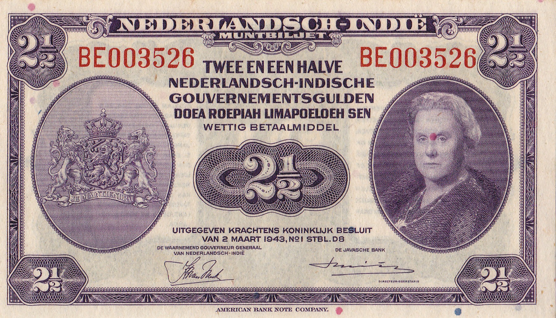 2 ½ Gulden 1943 Muntbiljet Wilhelmina. Pick 112a; PL NI-28.3a [# BE 003526]. UNC.