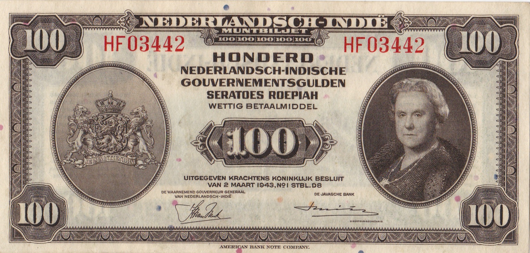 100 Gulden 1943 Muntbiljet Wilhelmina. Pick 117a; PL NI-28.8a [# HF 03442]. Bijna UNC.
