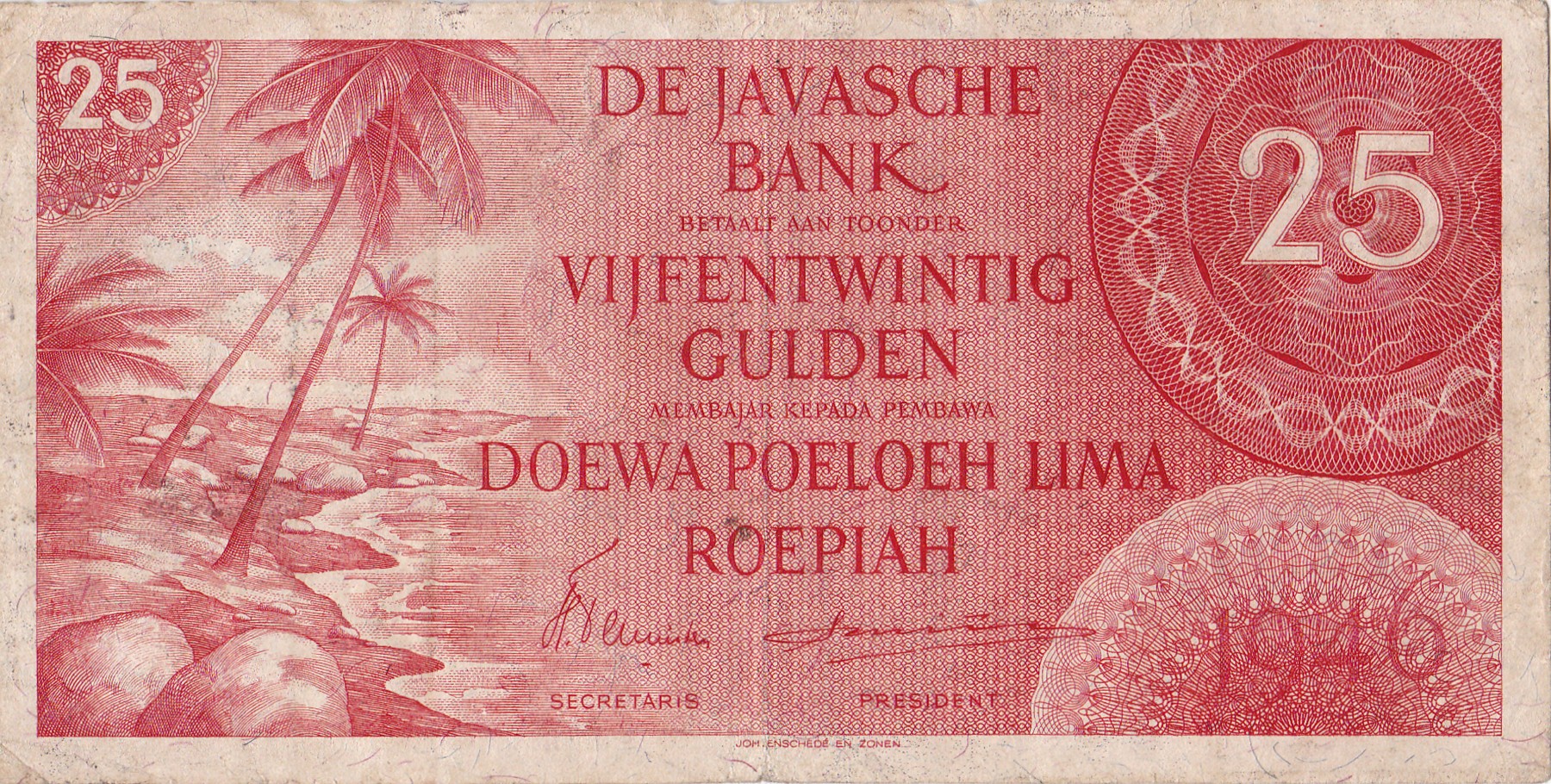 25 Gulden 1946 Palmstrand, rood. Pick 92; PL NI-29.3a [# LB 043507]. Zeer fraai.