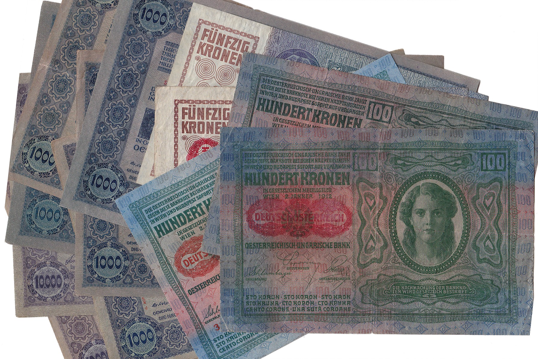 Lot (12) 50 Kronen (2), 100 Kronen (3), 1000 Kronen (5) en 10.000 Kronen (2) 1919 issue. Pick 54a (2), 55a (3), 57 t/m 62, 64. Fine / VF.