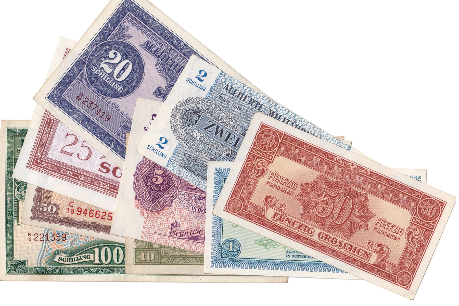 Lot (9) 50 Groschen t/m 100 Shilling 1944 issue. Pick 102 t/m 110a. VF and better.