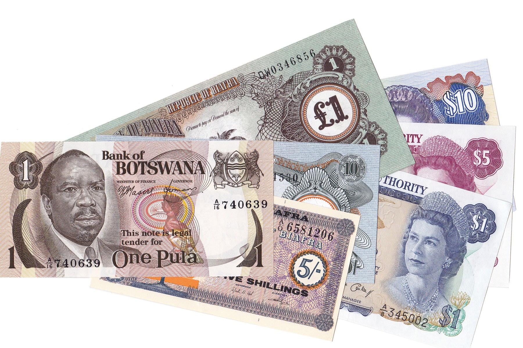 Lot (7) 1, 5 en 10 Dollars Bermuda. Pick 28c, 29b en 36. 5 Shililng, 10 Shilling en 1 Pound Biafra. Pick 1, 4 en 5. One Pula Botswana. Pick 1. Almost UNC.