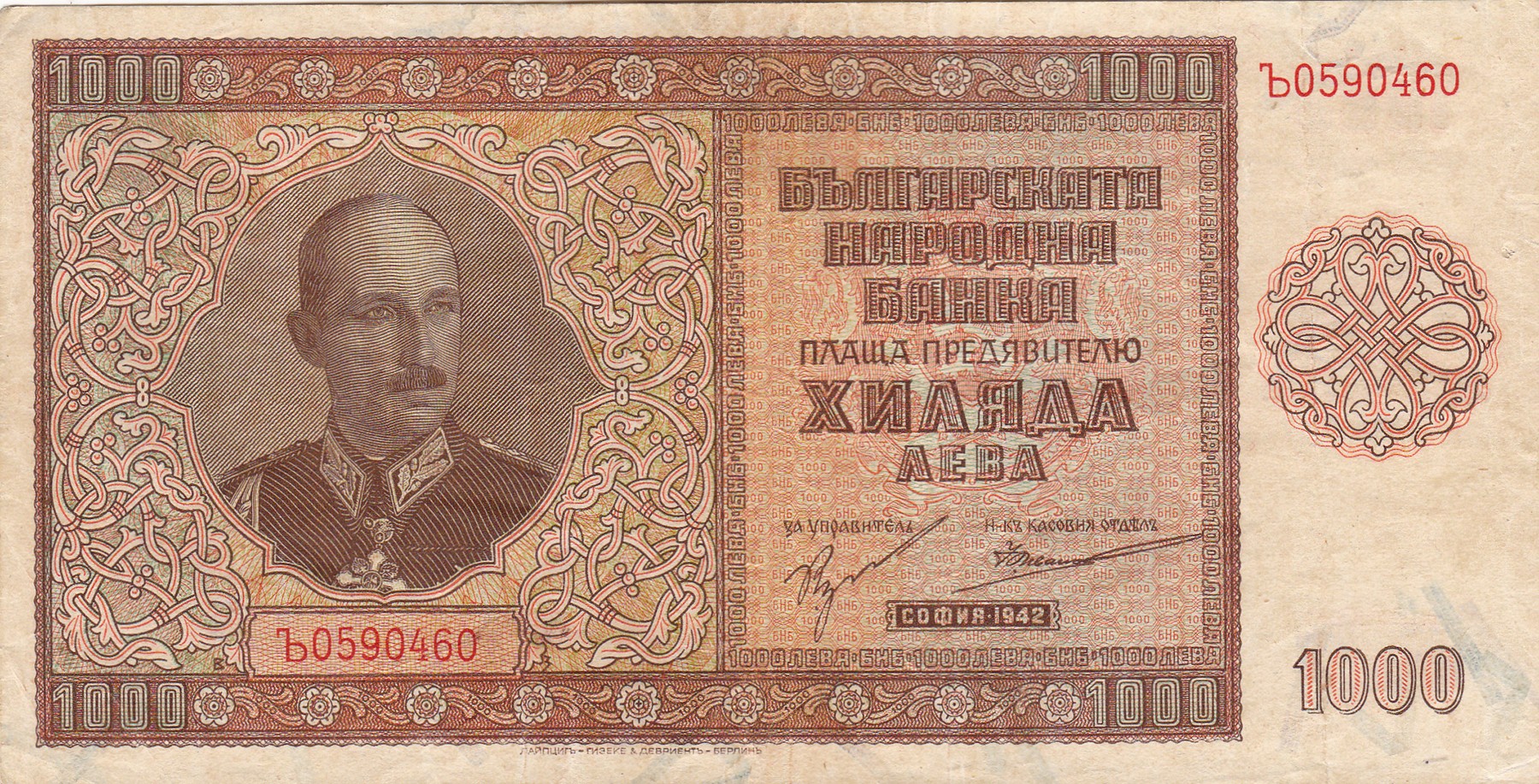 1000 Leva 1942 issue. Pick 61 [# 0590460]. Fine / VF.