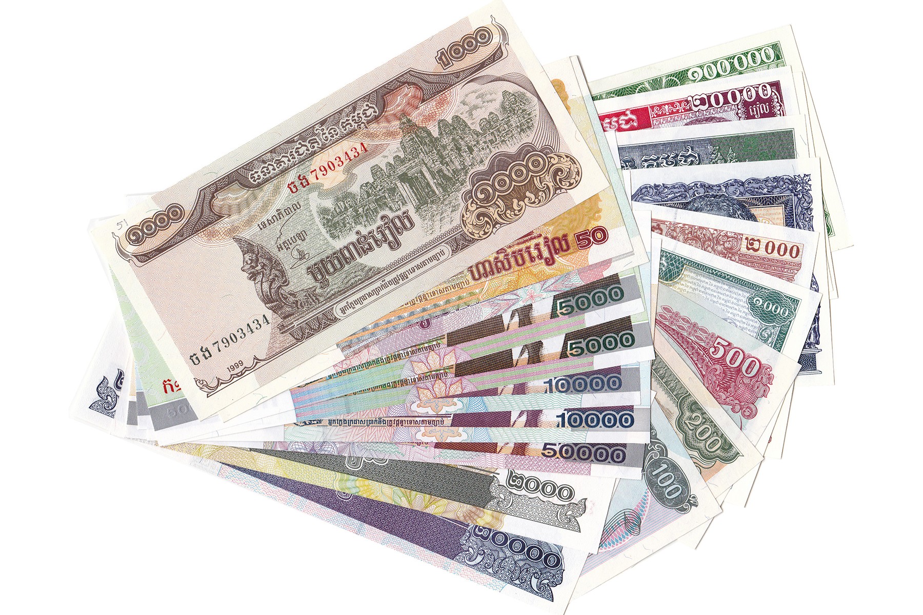 Lot (22) met verschillende denominaties Cambodia waaronder enkele complete series zoals 100 Riels t/m 100.000 Riels 1995 issue; 50 Riels t/m 50.000 Riels 2001-2002 issue. Pick 41 t/m 48, 49b1, 50 t/m 60. Almost UNC.