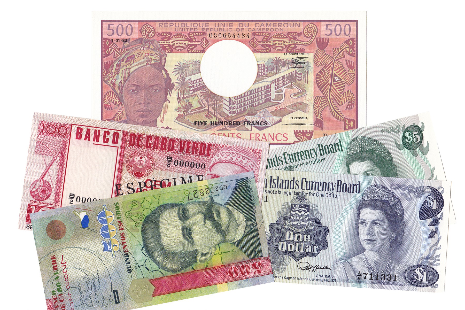 Lot (5) met o.a. 100 Escudos 1977 Espécime Cape Verde; 1 + 5 Dollars 1974 Cayman Islands en 500 Francs 1983 Cameroun. Pick 54S2, 69, 5e, 6a, 15a. Almost UNC.