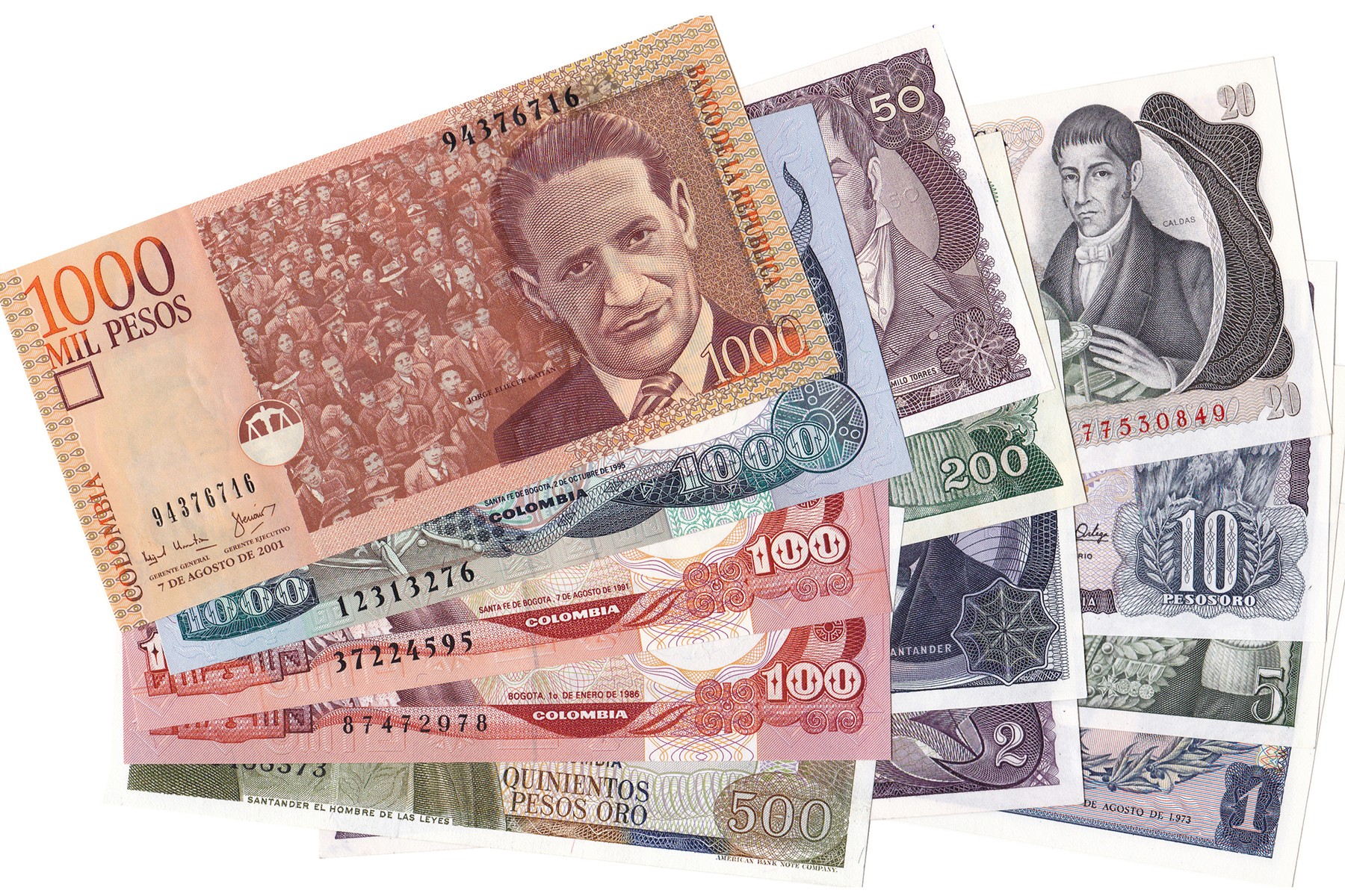 Lot (13) met verschillende denominaties Colombia. Pick 404e, 406f, 407g, 409d, 413, 415a, 419, 420b, 425a, 426b, 426A, 438, 450a. Almost UNC.