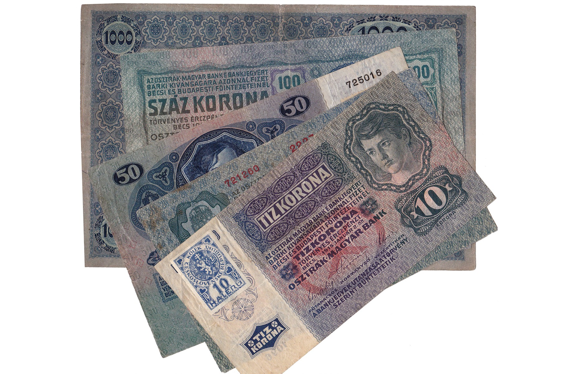 Lot (5) 10 Korun t/m 1000 Korun 1919 Provisional issue. Pick 1 t/m 5. Fine / VF and better.