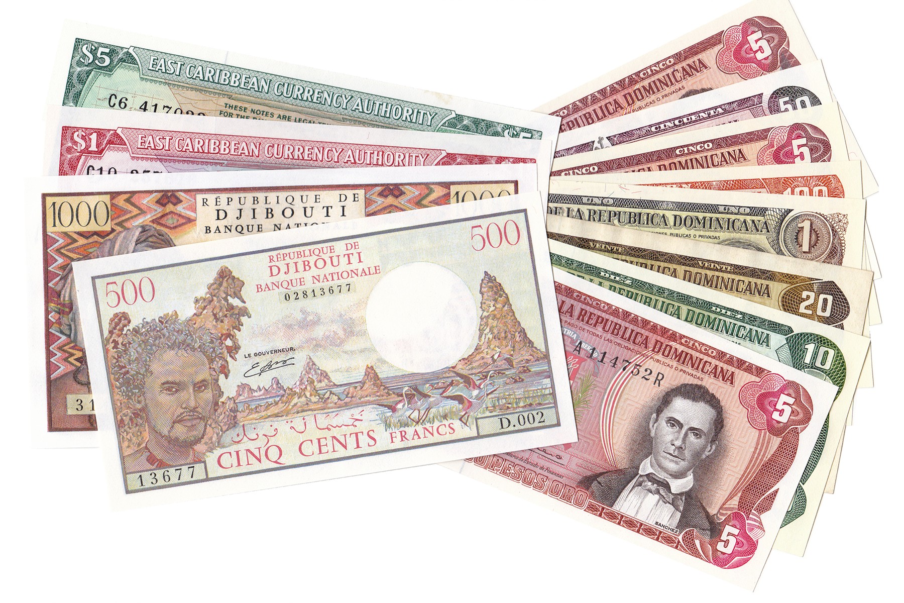 Lot (12) verschillende denominaties van bovenstaande landen, o.a. 500 en 1000 Francs Djibouti 1979; 1988. Pick 36b, 37b; 118b, 119c, 120c, 126c, 128b, 131; 135, 147, 13L, 14h. Almost UNC.