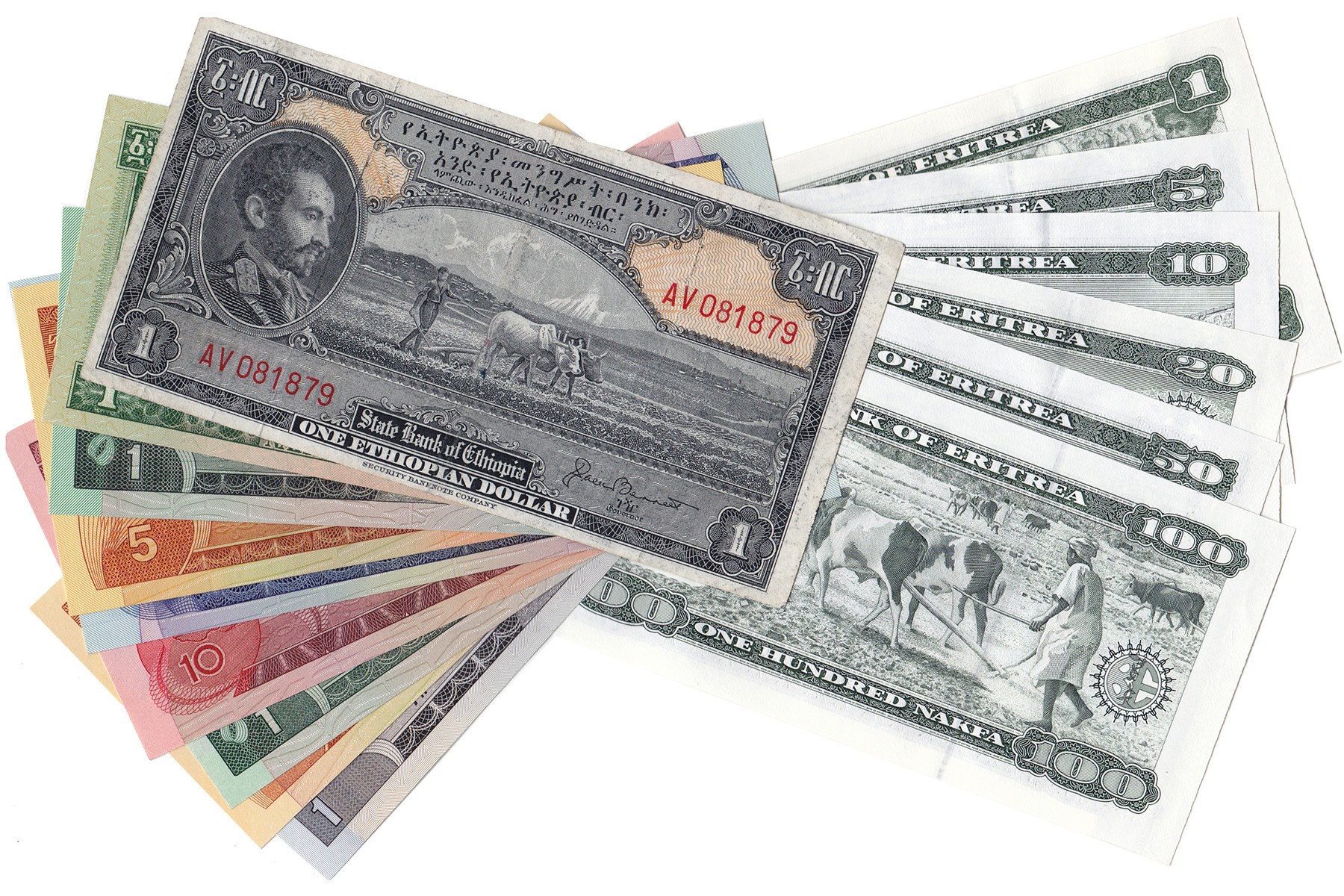 Lot (15) 1 Nakfa t/m 100 Nakfa 24-5-1997 complete serie Eritrea. Pick 1 t/m 6. Verder verschillende denominaties Ethiopië (9) waaronder 1 Dollar ND 1945 en 50 Birr 1976. Pick 12b, 25a, 30b, 31b, 33b, 41b, 42b, 38, 46a. Almost UNC.